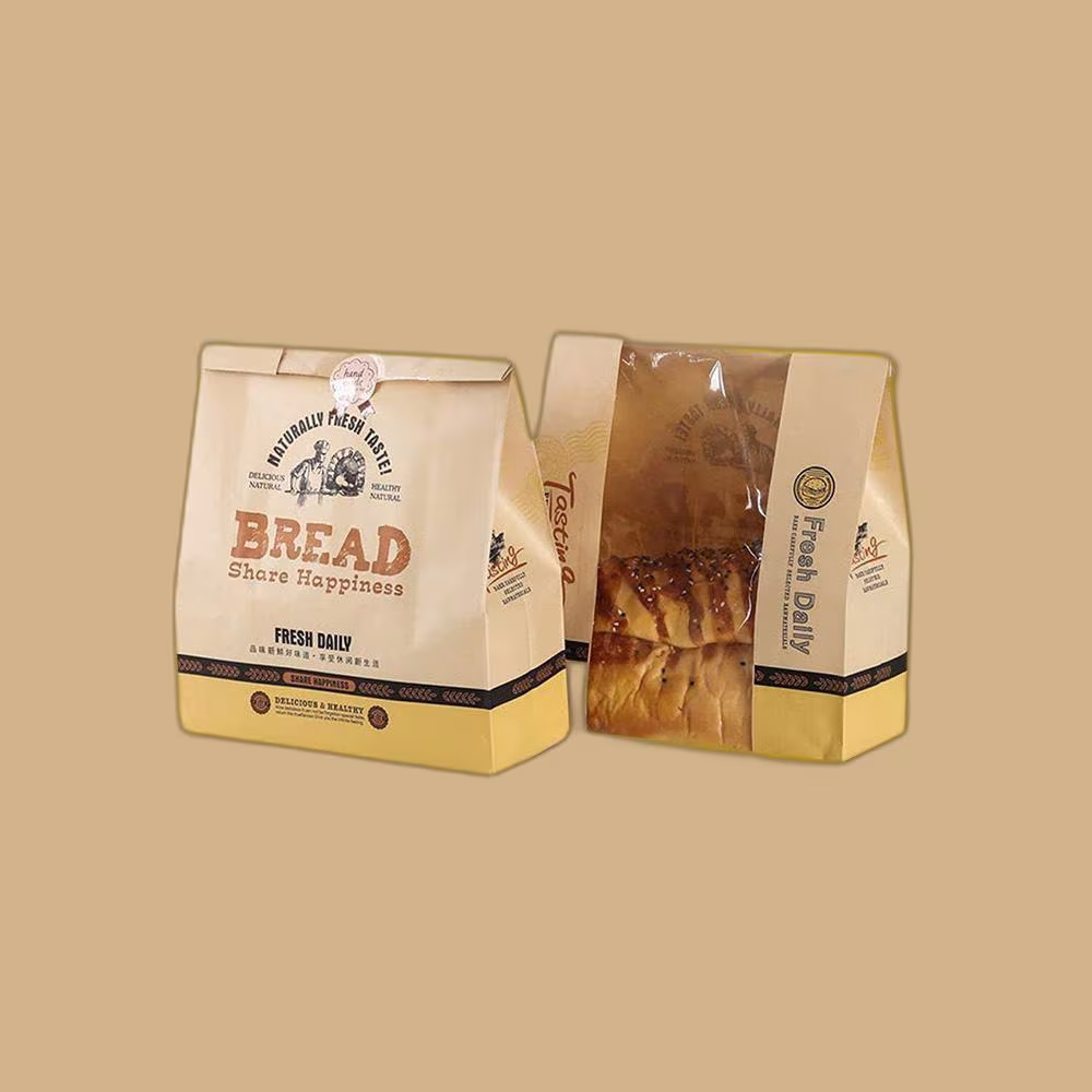 Die-cut shape is layered with plastic film to feature a window showcasing the product inside.
